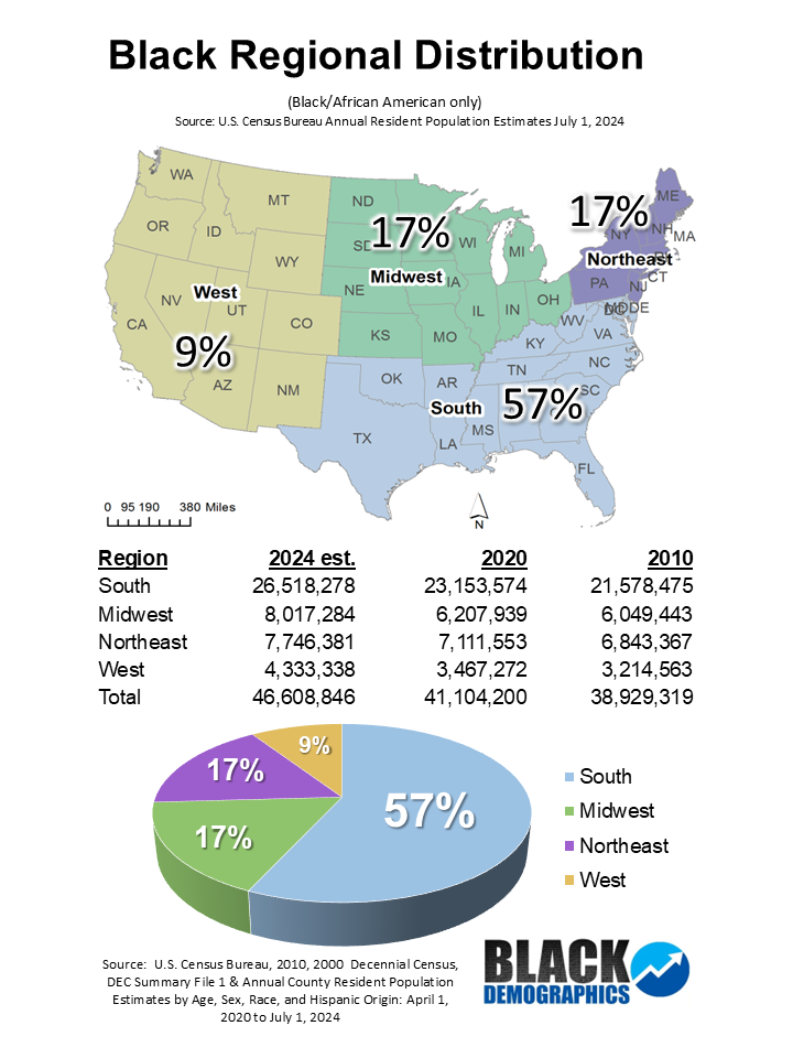 More than half (57%) of the African American population lives in the South, up from 53% in 1990. Although the Black Population has increased in all US regions since 1990, the South has had the most growth. The share of the Black population in the Northeast and Midwest has decreased from 19% in 1990 to 17% in 2019 for both regions.